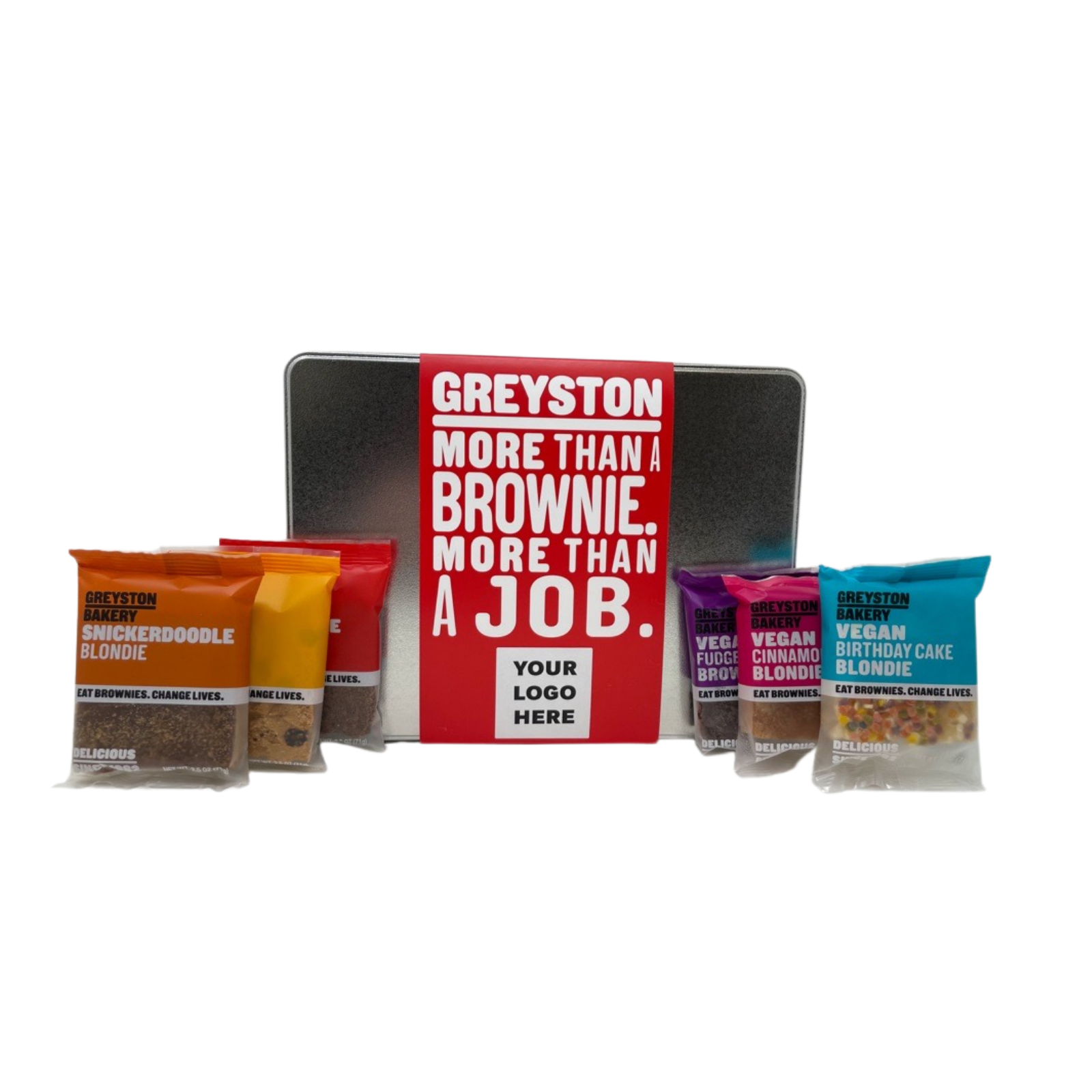 Give a gift that gives back with this 18-piece tin - it's perfect for an individual (or group of brownie lovers) who cherish variety!  Share the joy - everyone will be pleased as they get their favorite (or a new favorite) in this gift which includes 3 each of six delicious flavors. Include your logo, and a personal message or supply your own gift cards to send joy with a customized flair.  ***As a BONUS, this gift now includes a Greyston Bakery Brownie refrigerator magnet attached to the tin!***